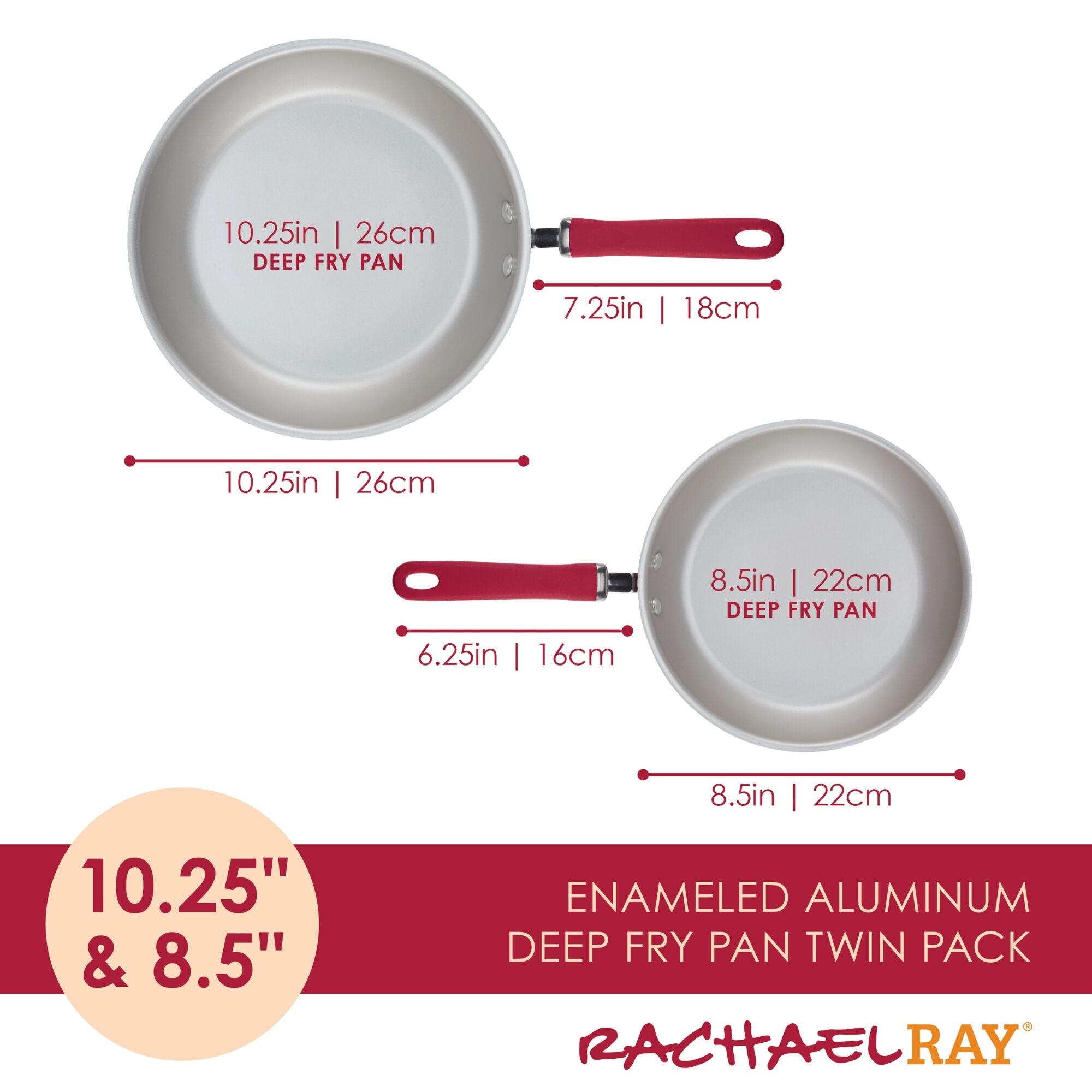 High-performance and easy convenience is twice as nice with two essential kitchen skillets featuring a deeper and more versatile pan design. Made with higher sides for an enhanced cooking surface. these smart frying pans from Rachael Ray feature PlatinumShield nonstick reinforced to be 9x harder than titanium for effortless food release of the stickiest recipes. Even better. the frying pans are dishwasher safe for quick and easy cleanup. Colorful. double-riveted handles provide comfort and control that’s oven safe to 400°F. flared rims make for easy pouring. and induction-suitable stainless steel bases provide strength. durability. and versatility to use the skillets on any stovetop.