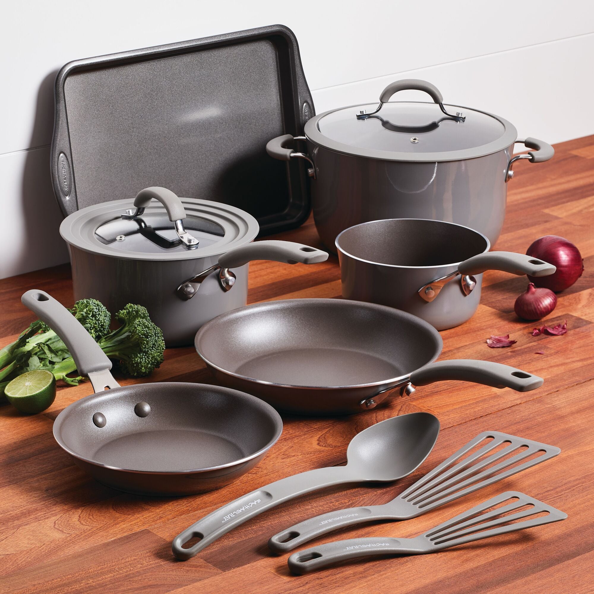 This set of fun and super-functional pots and pans is crafted from thicker gauge aluminum for a luxe and sturdy feel and reliable stovetop performance that heats up quickly and evenly. Featuring universal silicone-rimmed. tempered glass lids with a unique steam vent which provide a soft landing to lock in heat and flavor on your favorite recipes. Less lids. less clutter! The on-trend. contemporary design features a tulip-shaped profile for bigger and wider cooking surfaces that can take on those one pot meals. A new. triple layer nonstick provides the ultimate in scratch resistance and durability. and all of the cookware pieces are oven safe to 400??F. For even more of what you want (and less of what you don’t). reach for Rachael Ray Cook + Create cookware and uplevel your mealtime moments with performance and flair.