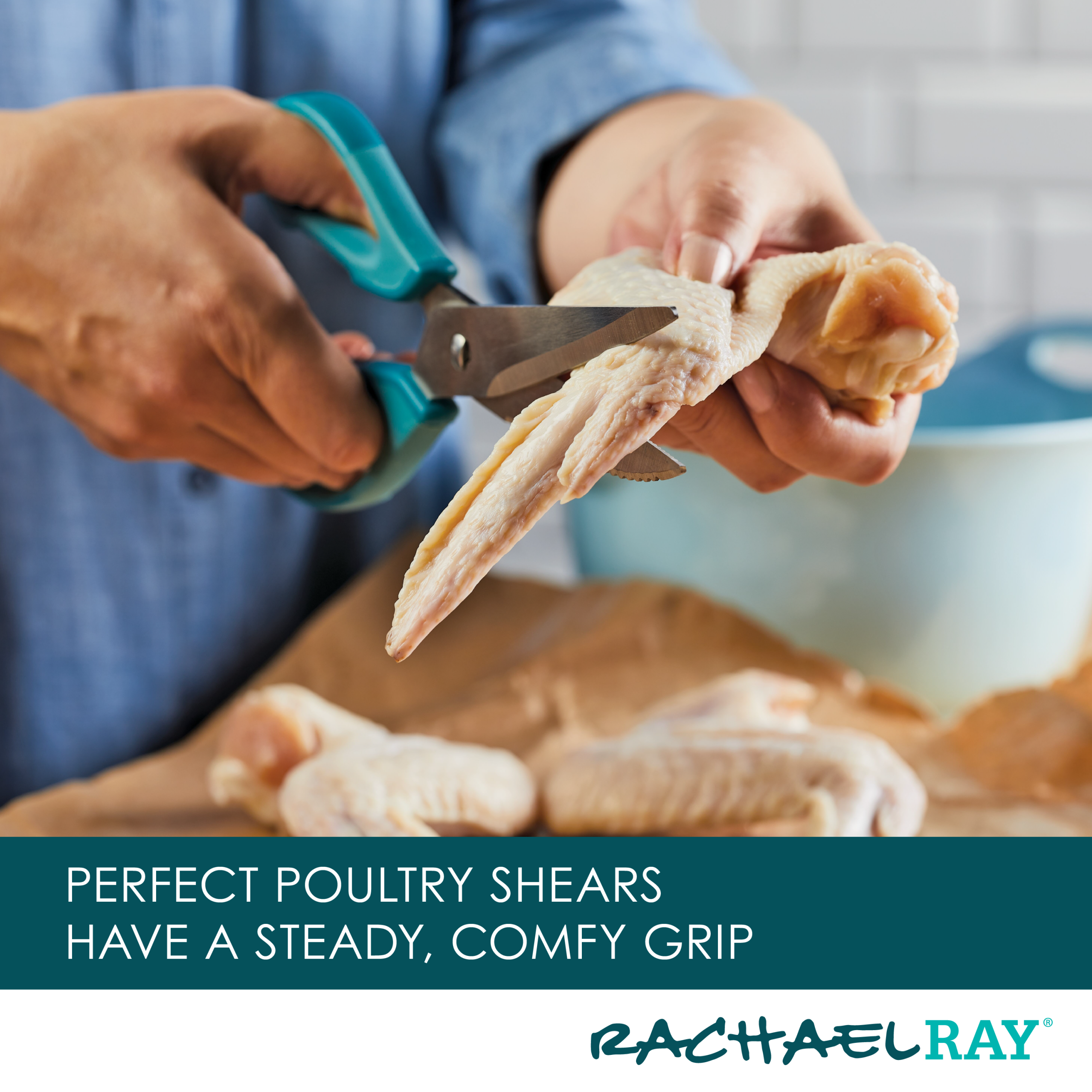 Snip. trim. slice. and strip with these multipurpose kitchen shears from Rachael Ray. A practical design make these prep scissors ideal for a wide range of kitchen tasks. from trimming poultry and meats to cutting vegetables. leafy greens. and even thin sheets of dough or parchment paper. An amazing protective sheath makes for magnet-easy storage on appliances or other steel kitchen surfaces. Japanese stainless steel blades stay ultra sharp for effortless cutting. and the comfy. grippy handles are topped with a convenient bottle opener and screwdriver. The sheath features six graduated stripping holes for quickly removing thyme. rosemary. cilantro. and kale leaves from their stems. plus the heavy duty shears separate easily into two pieces for use as a fish scaler or scraper and pop right in the dishwasher for easy. spotless cleanup.